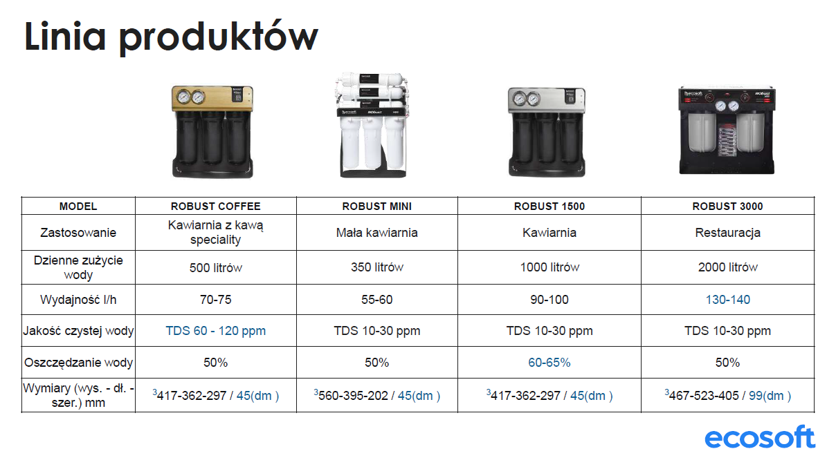 RObust 1500 to zaawansowany system odwróconej osmozy firmy Ecosoft. Filtr zaprojektowany do pracy w wymagających środowiskach komercyjnych, takich jak kawiarnie, restauracje, hotele, szkoły, laboratoria, gabinety dentystyczne oraz biura. Dzięki wydajności 90 litrów na godzinę i solidnej konstrukcji zapewnia niezawodny dostęp do czystej wody. Oszczędza miejsce (417 х 362 х 300 mm), a także umożliwia łatwy dostęp do komponentów wymiennych, co znacznie ułatwia konserwację.