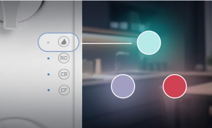 Kolorowy wskaźnik na kraniku wody oczyszczonej i przednim panelu filtra przypomina o konieczności wymiany filtrów.